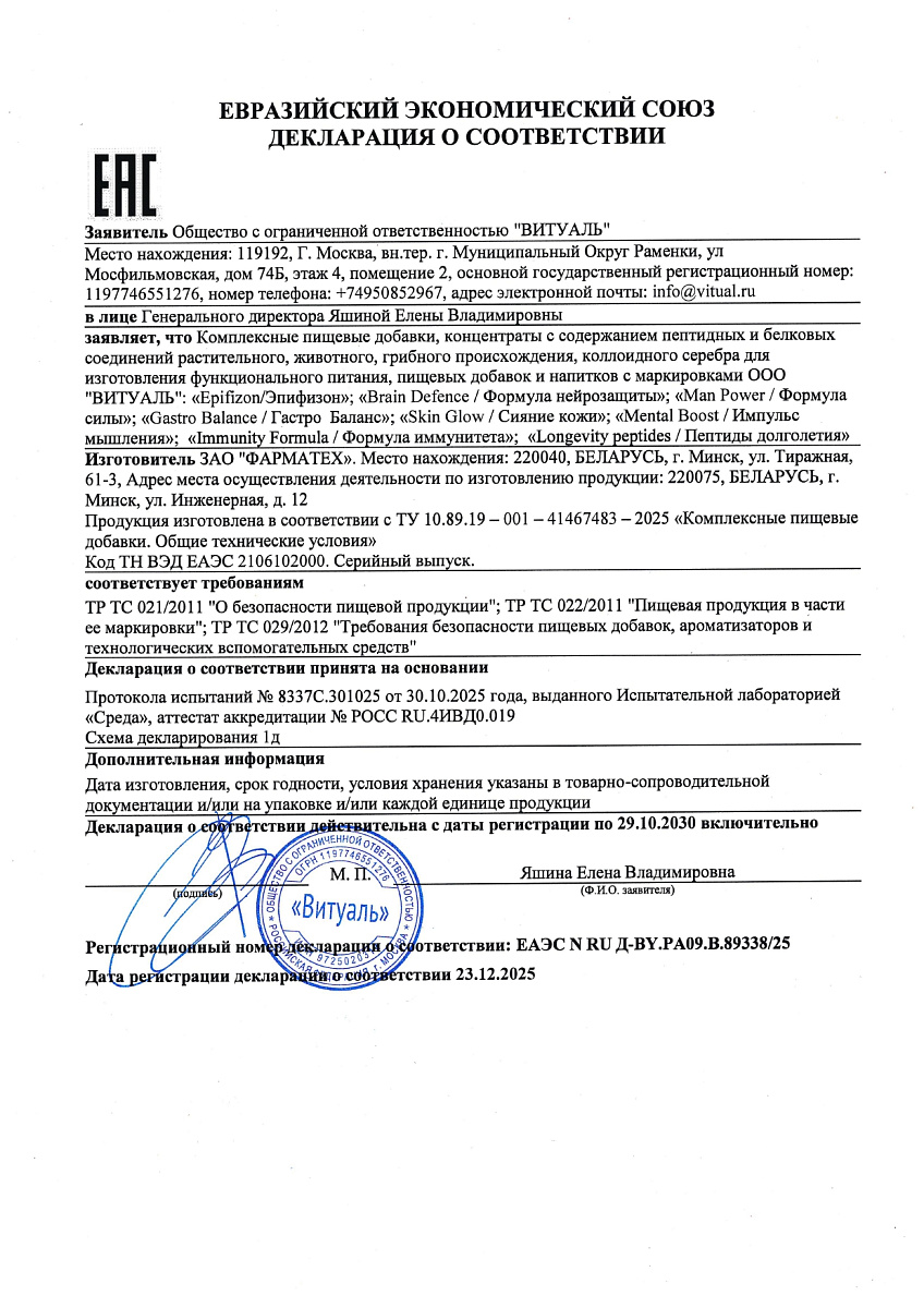 Этот компонент делает формулу более необычной и специализированной. В пептидных продуктах такого типа его чаще связывают с поддержкой процессов клеточного обновления и антиоксидантного баланса. Если говорить проще, это тот элемент состава, который делает уход более «умным»: не только смягчает внешний вид кожи, но и добавляет формуле направленность на возрастные изменения, стрессовые факторы и общее качество стареющей кожи.