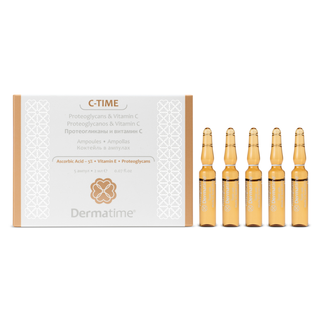 Коктейль с протеогликанами и витамином С 5 ампул по 2 мл Dermatime - ультраконцентрированный препарат мощного антивозрастного действия. Благодаря высокоактивному составу оказывает на кожу выраженное увлажняющее, лифтинговое, тонизирующее и реструктуризирующее действие. Стимулирует клеточное обновление, блокирует активность свободных радикалов, предотвращая процессы старения. Разглаживает морщины, снижает выраженность купероза, ликвидирует признаки усталости, активизирует кровоток. Дарит коже свежесть, упругость и здоровое сияние.