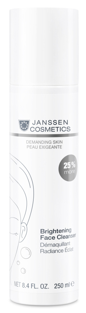 Очищающая эмульсия для сияния и свежести кожи (Brightening Face Cleanser) от Janssen Cosmetics, 250 мл — нежное средство «2-в-1», сочетающее эффективное очищение и уход за кожей. Эмульсия мягко удаляет макияж и загрязнения, одновременно увлажняя и выравнивая тон кожи, придавая ей естественное сияние.