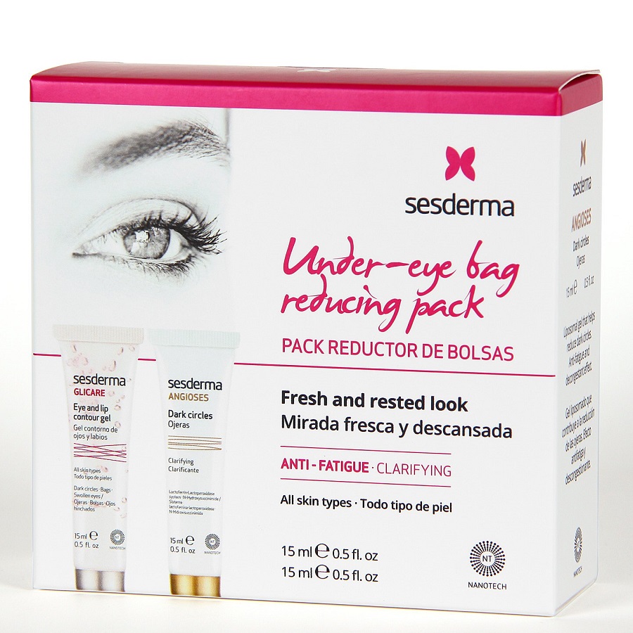 Набор гелей от тёмных кругов под глазами Sesderma включает два средства – лёгкий осветляющий крем ANGIOSES (15 мл) и гель-контур GLICARE (15 мл). Средства эффективно устраняют тёмные круги и следы усталости, и бережно ухаживают за деликатной кожей вокруг глаз – увлажняют, тонизируют, улучшают выработку коллагена и микроциркуляцию в тканях. Осветляющее средство содержит экстракты гингко билоба, конского каштана, куркумы, ретинол, а также витамин С. Контурирующий гель создан на основе органического кремния, гиалуроновой кислоты, экстрактов донника и босвелия серрата. Набор от тёмных кругов разработан с использованием технологии NANOTECH™, благодаря которой ценные активные ингредиенты быстро и эффективно доставляются в глубокие слои кожи, усиливая полезное действие гелей.
