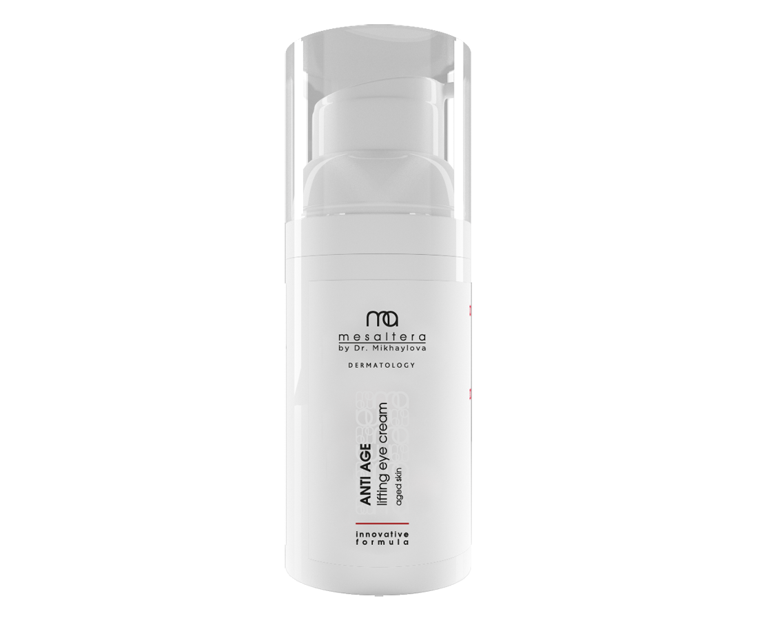 Анти эйдж крем для глаз с лифтинг эффектом MESALTERA by Dr. Mikhaylova - мультикомплексное средство для борьбы с фото- и хроностарением кожи в периорбитальной области. Эффект от использования крема сравним с результатами выполненной блефаропластики. Входящий в состав биотехнологичный комплекс BEAUTIFEYE™ оказывает на кожу век выраженное подтягивающее действие, уменьшает выраженность “гусиных лапок”, устраняет отеки и осветляет темные круги под глазами. Уникальный биокомплекс MATRIXYL® synthe’6 оказывает эффект заполнения морщин, способствует дермореструктуризации тканей, возвращая коже гладкость, упругость и эластичность. Сокращает количество морщин и препятствует их возникновению.