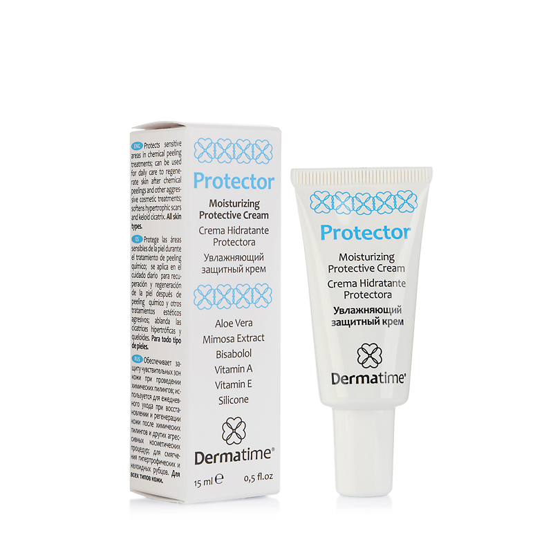Увлажняющий защитный крем Dermatime восстанавливает гидролипидный баланс кожи, защищает ее от агрессивного влияния внешних раздражителей. Благодаря высокой концентрации защитных компонентов, крем интенсивно восстанавливает и питает кожу, стимулирует процессы заживления и обновления. Он надежно защищает чувствительную кожу перед нанесением химических пилингов. Рекомендуется для ускорения репаративных процессов в коже после травматичных эстетических процедур. Крем хорошо смягчает гипертрофические и келоидные рубцы.