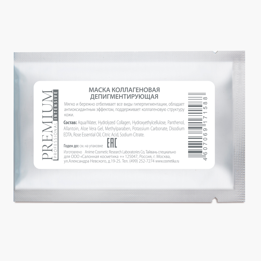 Маска коллагеновая депигментирующая для домашнего и профессионального применения. Деликатно устраняет эстетические недостатки, эффективно отбеливая все виды гиперпигментации на коже любого типа, в том числе веснушки. Стимулирует регенерационные процессы в тканях. Работает как антиоксидант. Заботится о поддержке коллагеновой структуры кожи, тонизирует ее.