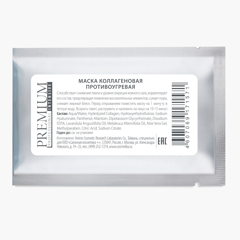 Маска коллагеновая противоугревая (для лица) для домашнего и профессионального применения помогает при жирной коже с угревой сыпью и служит профилактикой ее повторного появления. Регулирует работу сальных желез, замедляя выработку себума с коррекцией его состава. Купирует воспалительные процессы, успокаивает. Обладает сосудосуживающим действием.