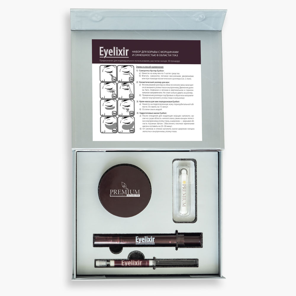 Набор для борьбы с морщинами и синюшностью EYELIXIR для ухода за периорбитальной областью. Сыворотка-бустер насыщает влагой, способствует лучшей микроциркуляции крови кожи век, снимает отеки и темные круги под глазами, удаляет мелкие морщины, добавляет упругости. Гиалуроновая крем-маска мгновенно убирает синеву, «мешки» под глазами и мимические морщины у глаз. Гидрогелевые маски напитывают влагой и полезными веществами, снимают отечность, способствуют гладкости, эластичности и упругости, повышают тонус, убирают синеву под глазами.