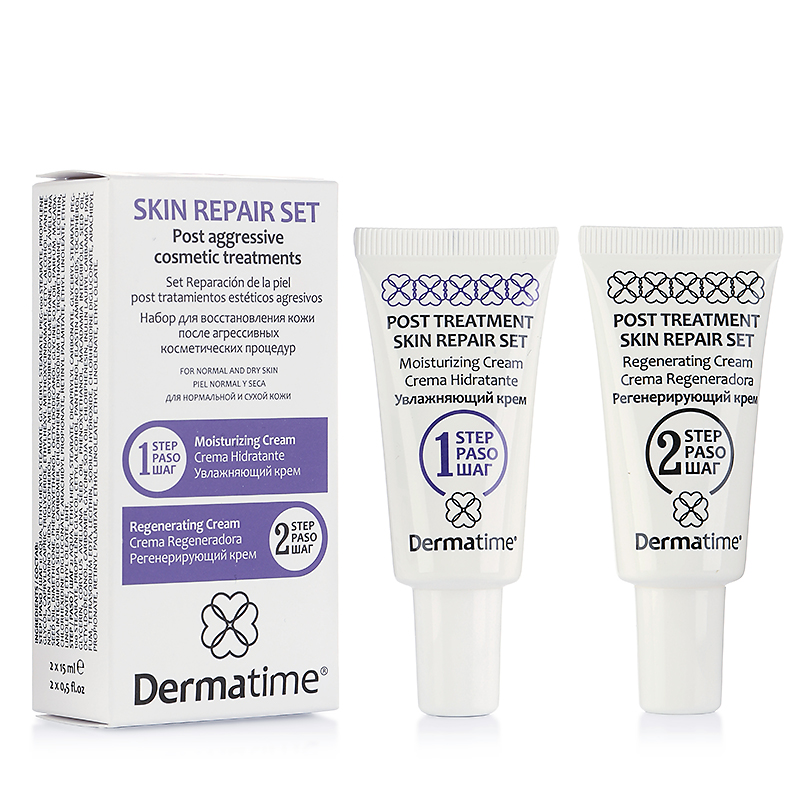 Набор для восстановления нормальной и сухой кожи Dermatime включае в себя 2 продукта: увлажняющий и регенерирующий кремы. В их состав входят инновационные пептиды, стимулирующие обновление эластиновых волокон, репаративные процессы и восстановление кожи после химических пилингов и других травматичных эстетических процедур. Насыщенный состав обоих средств обеспечивает укрепление защитного барьера кожи, повышение ее устойчивости к влиянию неблагоприятных внешних агентов. Они оказывают на кожу регенерирующее, седативное, увлажняющее действие, предотвращают процессы воспаления и раздражение кожи, действуют противомикробно и усиливают тканевой иммунитет. Снижают чувствительность даже самой реактивной кожи, блокируют активность кислородных радикалов, предупреждая окислительный стресс. Активируют процессы ревитализации и омоложения кожи.