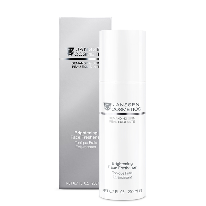 Тоник для сияния и свежести кожи (Brightening Face Freshener) от Janssen Cosmetics — это нежный ревитализирующий тоник, разработанный для завершения этапа очищения и мгновенного увлажнения кожи. Он особенно подходит для кожи с первыми признаками возрастных изменений: тусклой, уставшей, сухой, с неровным тоном и ранними морщинами. Тоник не содержит спирта и обладает приятным цветочным ароматом.