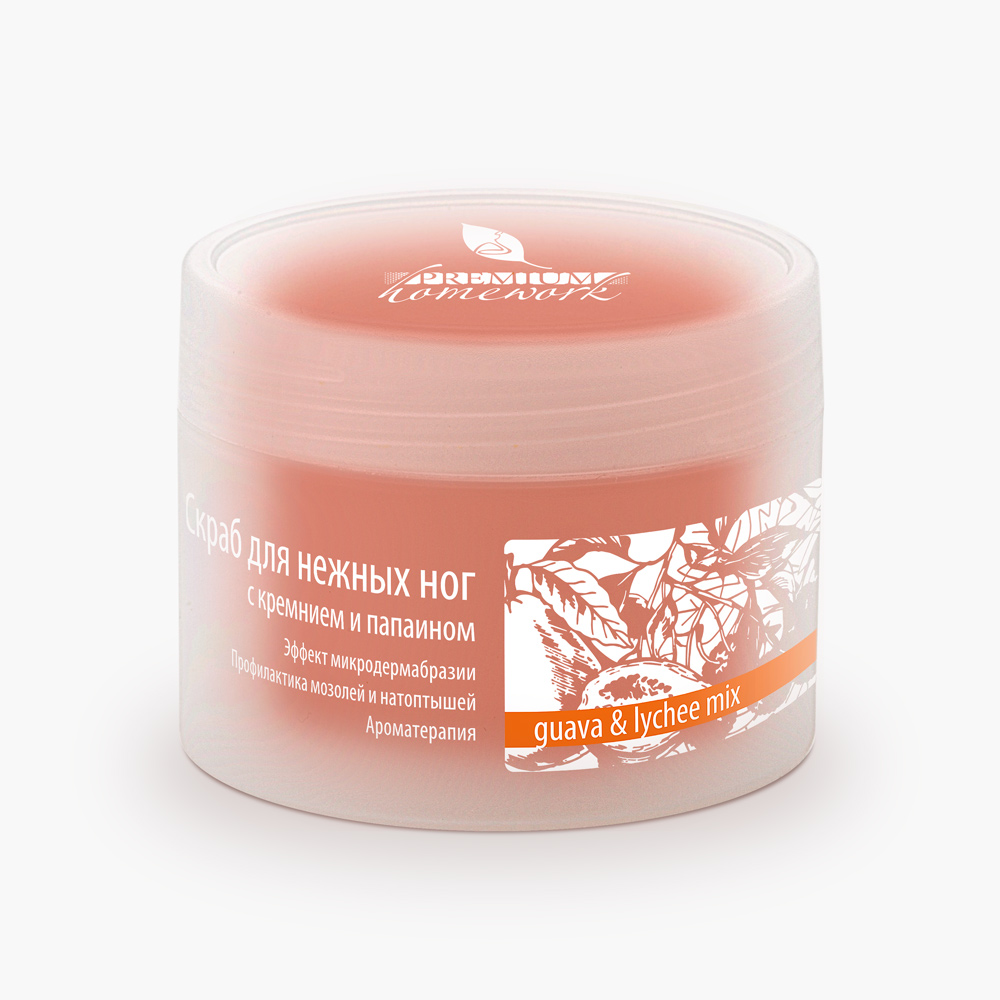 Скраб для нежных ног с кремнием и папаином с приятным ароматом тропических фруктов для глубокого очищения кожи стоп. Работает как поверхностный щадящий пилинг, так и абразивный со значительным воздействием на эпидермис. Избавляет от ороговевших клеток, продуктов обмена. Помимо очистки полирует кожу. Предотвращает образование мозолей, натоптышей, служит профилактикой потливости стоп.