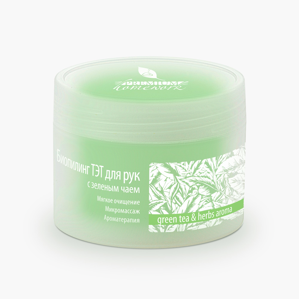 Биопилинг ТЭТ для рук с зеленым чаем и комплексом травяных экстрактов для ухода за тонкой, чувствительной и увядающей кожей, а также нуждающейся в увлажнении. Работает максимально деликатно, при этом глубоко очищая. Делает микромассаж, отшелушивая отмершие частички. Замедляет естественный процесс старения клеток. Уменьшает чувствительность кожи рук. Во время использования дарит приятный аромат.