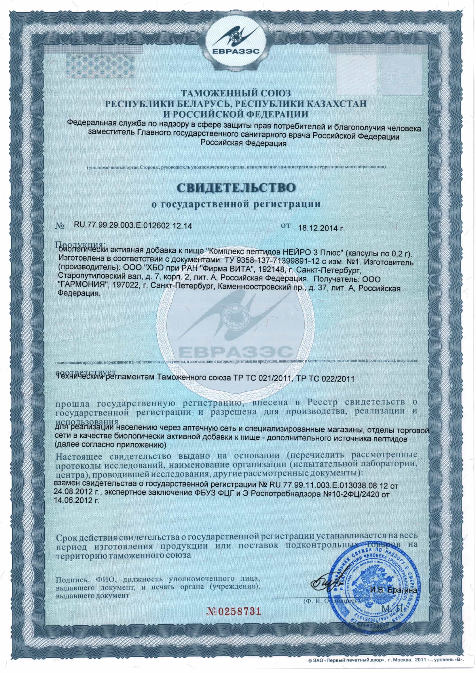 В состав каждой капсулы входят пептиды: ПЕПТИДЫ МОЗГА 10 мг (Нормализуют синтез собственных нейромедиаторов, способствуют улучшению передачи нервных импульсов, улучшают восстановление нервных клеток. Тем самым стимулируются когнитивные функции, повышается стрессоустойчивость, снижается эмоциональная лабильность). ПЕПТИДЫ СОСУДОВ 10 мг (Укрепляют стенки артерий и капилляров, нормализуют в них синтез коллагена и эластана, регулируют проницаемость и эластичность. Способствуют снижению риска появления атеросклеротических бляшек, а значит и тромбов. Улучшают питание мозга). ПЕПТИДЫ ПЕЧЕНИ 10 мг (Способствуют улучшению метаболической и детоксикационной функции гепатоцитов. Регулируют образование в них липидов, чем нормализуют соотношение холестерина, триглицеридов и липопротеинов в крови и снижают риск тромбообразования и развития инсульта).