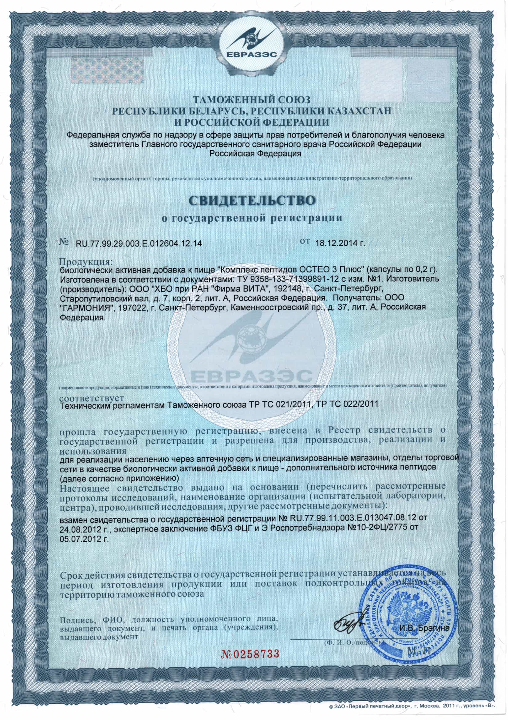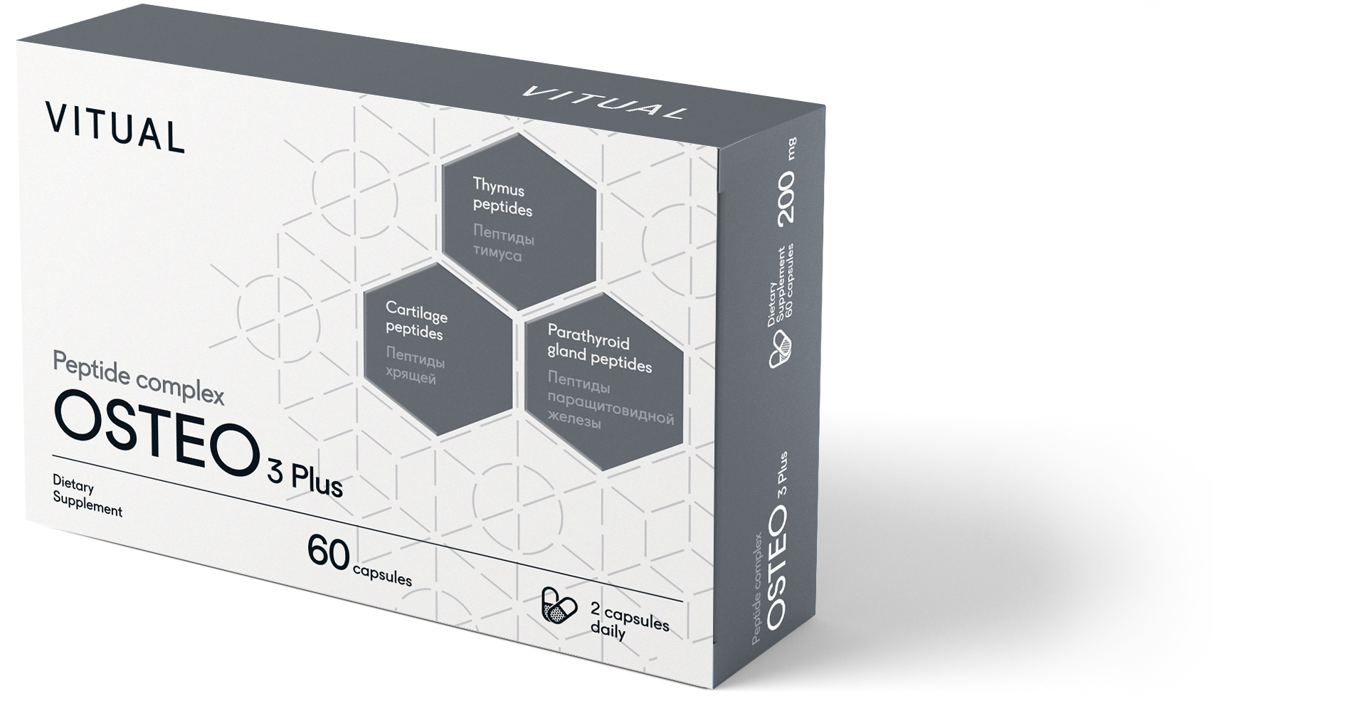 НАДЕЖНАЯ ОПОРА ДЛЯ ВАШИХ КОСТЕЙ. Пептидный комплекс OSTEO 3 Plus — это натуральное средство для поддержания здоровья опорно-двигательного аппарата. Сочетание пептидов в препарате подобрано таким образом, чтобы эффективно сохранять и насыщать костную ткань кальцием, защищать от повреждения и нормализовать выработку синовиальной жидкости в хрящевой ткани. Клинические испытания комплекса OSTEO 3 Plus показали его эффективность в активации синтеза сшитого коллагена. Это дает возможность при помощи пептидов тормозить возрастные изменения в коже, а в сочетании с кальцием — укреплять волосы и ногти. OSTEO 3 Plus — находка при стоматологических проблемах. Нормализуя насыщение тканей кальцием, пептиды создают защиту от кариеса, улучшают состояние периодонта, а при протезировании улучшают его результат.