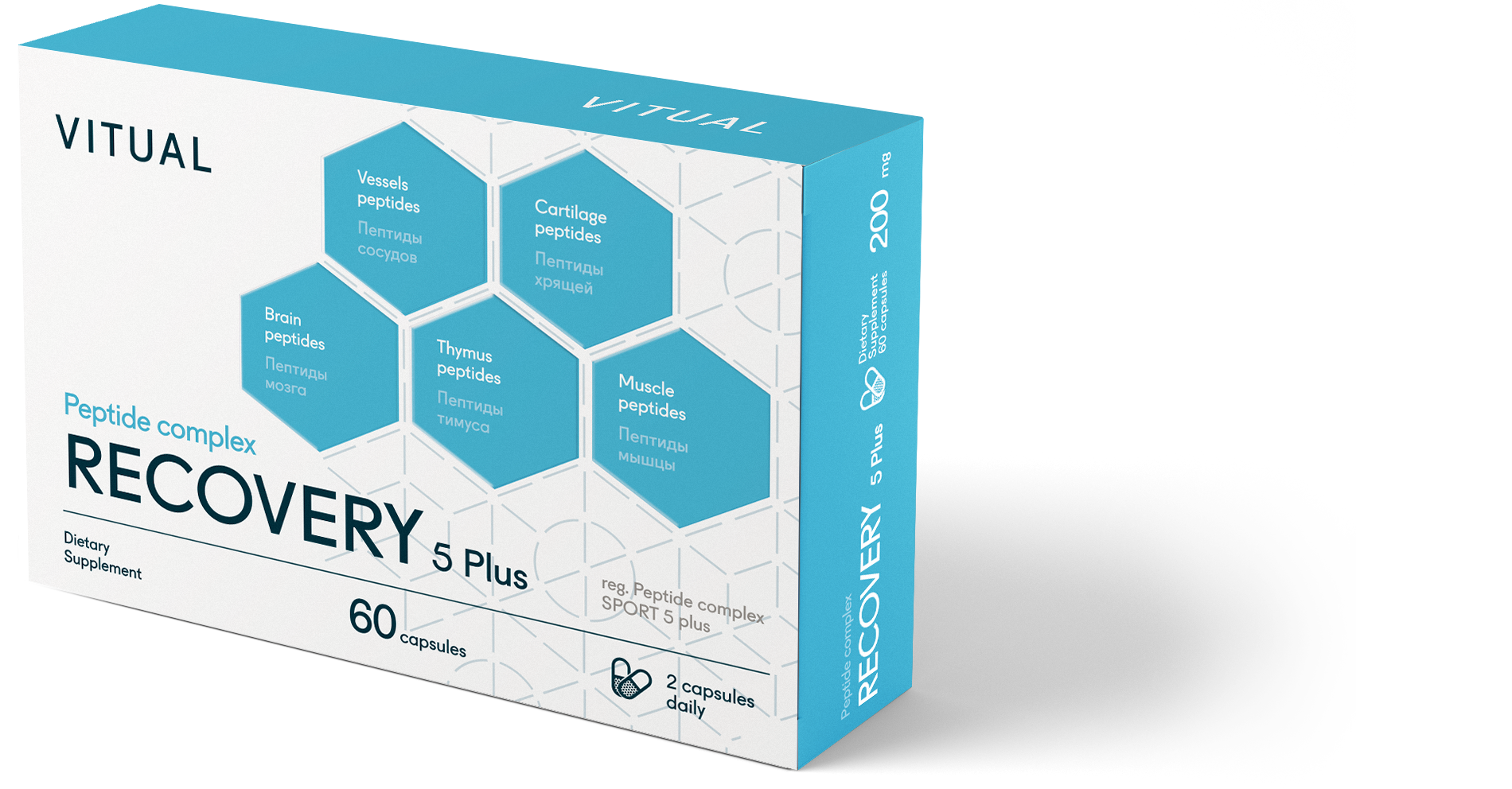 КРАСОТА И ЗДОРОВЬЕ ИЗНУТРИ Пептидный комплекс RECOVERY 5 Plus — это натуральное средство, которое содержит пять взаимодополняющих пептидов. Сочетание биорегуляторов хрящей, мышц, тимуса, мозга и сосудов позволяет укреплять и восстанавливать функции опорно-двигательного аппарата, заботиться о здоровье суставов и молодости кожи. Это средство подойдет для тех, кто хочет быстро и эффективно реабилитироваться после операции или травмы, укрепить и подготовить свой организм к повышенным психическим или физическим нагрузкам или избавиться от последствий перегрузок. Комплекс RECOVERY 5 Pus — это эффективный способ решения косметологических проблем. Его пептиды запускают синтез сшитого коллагена, который необходим для поддержания упругости кожи, уменьшения морщин и защиты от влияния ультрафиолета и реакций гликации. Если нужно быстрое восстановление и укрепление здоровья — это тоже задача для RECOVERY 5 Plus. Активируя резервы организма, его пептиды позволяют ускорить регенерацию тканей, улучшить структуру опороно-двигательного аппарата и в разы повысить иммунитет.