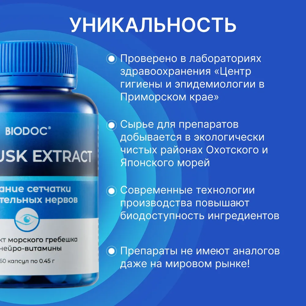 Пищевая добавка BIODOC "MOLLUSK EXTRACT" 60 капсул по 0,45г - препарат для комплексной поддержки зрения, снятия напряжения и усталости с глаз. Его уникальный состав на основе экстракта морского гребешка, таурина, лютеина обеспечивает улучшение зрения, защиту глаз от избыточной нагрузки, профилактику возрастных дегенеративных изменений сетчатки глаз. Способствует востановлению зрения при травмах глаз, после замены хрусталика и других офтальмологических операций. Препарат снижает спазм аккомодации, внутриглазное давление и утомляемость глаз, уменьшает дискомфорт в глазах при повышенной нагрузке на зрение.