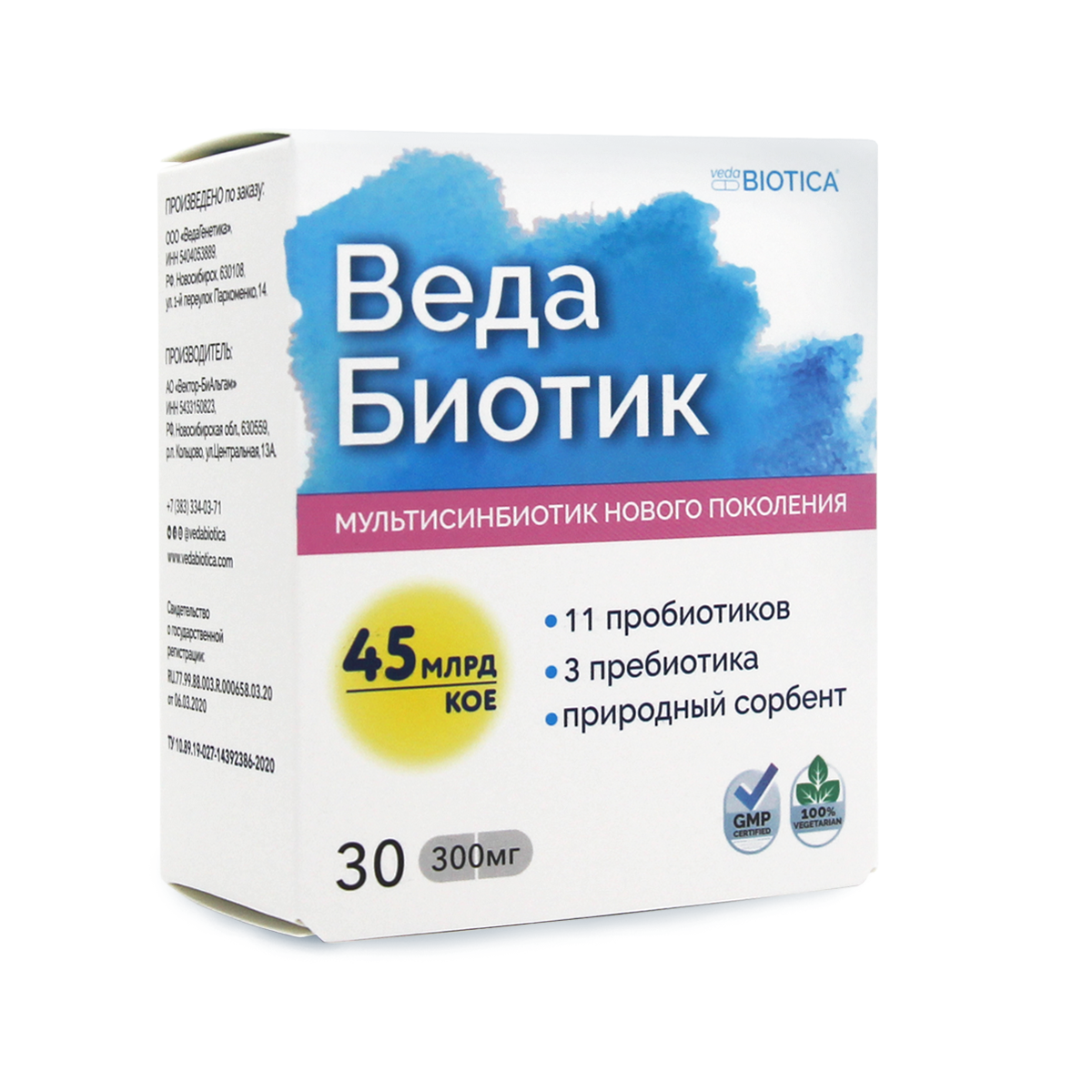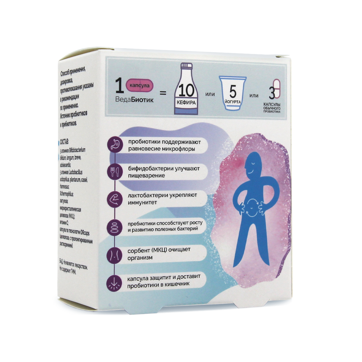 Взрослым и детям старше 3 лет по 1 капсуле 1 раз в день во время еды. Детям младше 5 лет содержимое капсулы высыпать в воду или молоко с температурой не выше +40ºС, перемешать и сразу выпить. Продолжительность приема – 1 месяц. При необходимости прием повторять 2-3 раза в год. Срок годности – 1 год. Хранить в сухом, защищенном от попадания прямых солнечных лучей и недоступном для детей месте, при температуре не выше +25°С. 1). При тяжелых или несанированных формах дисбактериозов, а также после интенсивной антибактериальной терапии рекомендуется прием ВедаБиотика по 1-2 капсуле 2-3 раза в день. Противопоказания: индивидуальная непереносимость компонентов продукта. Перед применением рекомендуется проконсультироваться с врачом, у детей – с педиатром.